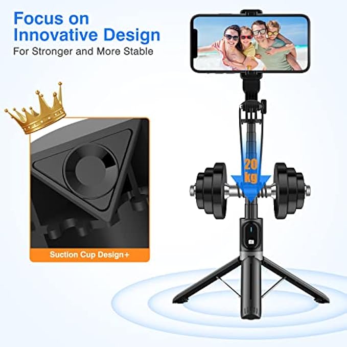 [Stronger And More Stable] The Camera Tripod with innovation suction cup design standing on different surfaces, it can load capacity 20 KG still keep STABLE .Antioxidant durable aluminum alloy made our phone tripod MORE STRONGER,Success to increase the iPhone tripod life time.This tripod super stable and non-slip,it never possible drop down your phone when take photos.